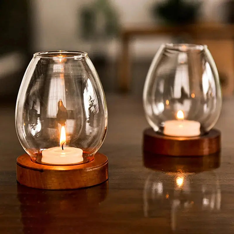 Como uma chama abraçada pelo vidro, este castiçal redondo com base de madeira espalha uma luz suave e protegida do vento, criando instantaneamente um clima romântico e acolhedor para jantares, momentos a dois ou festas sem esforço.